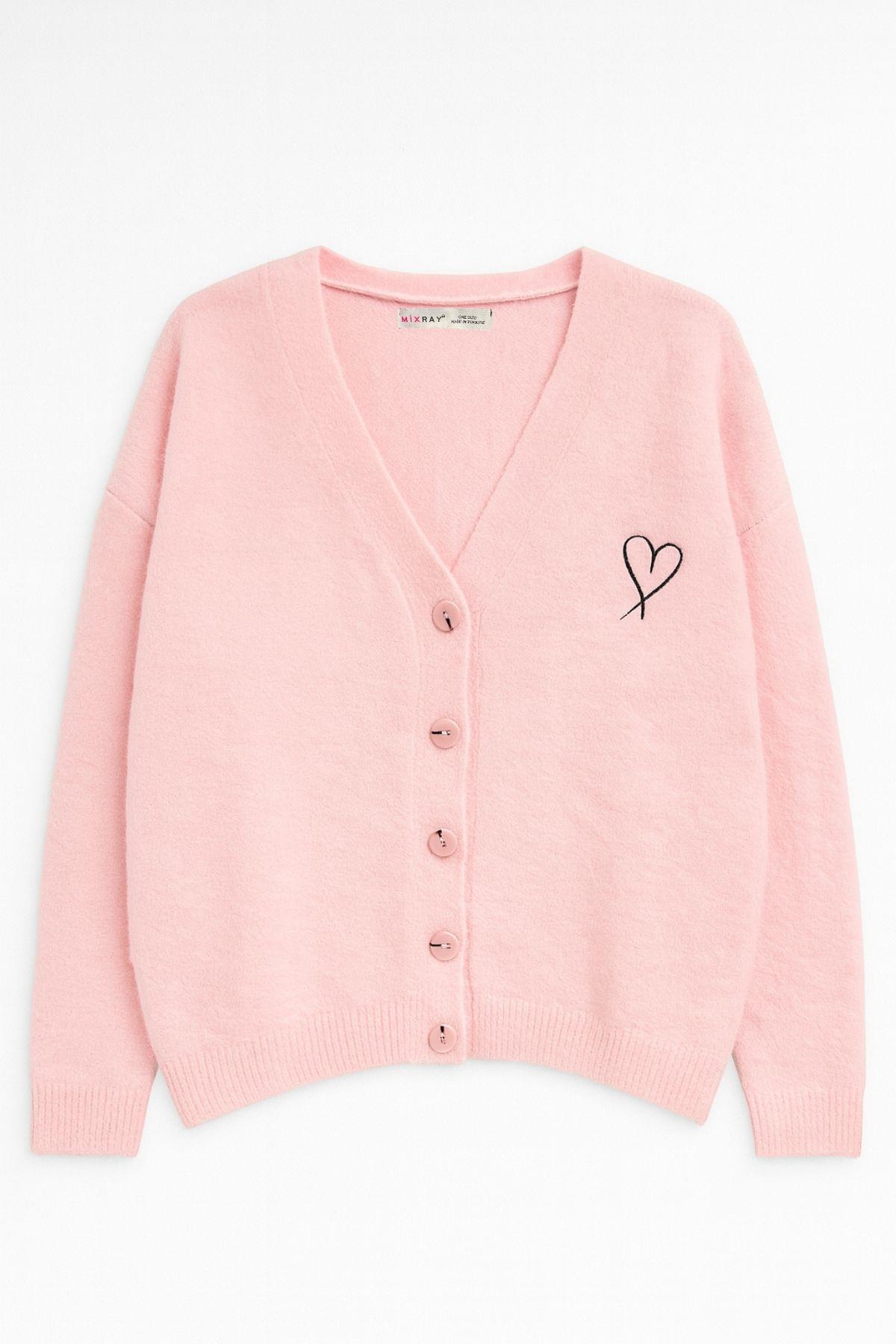 6953 Kadın Oversize Yün Karışımlı Premium Kalp Nakışlı Hırka Pembe (K25HRK6953-113)