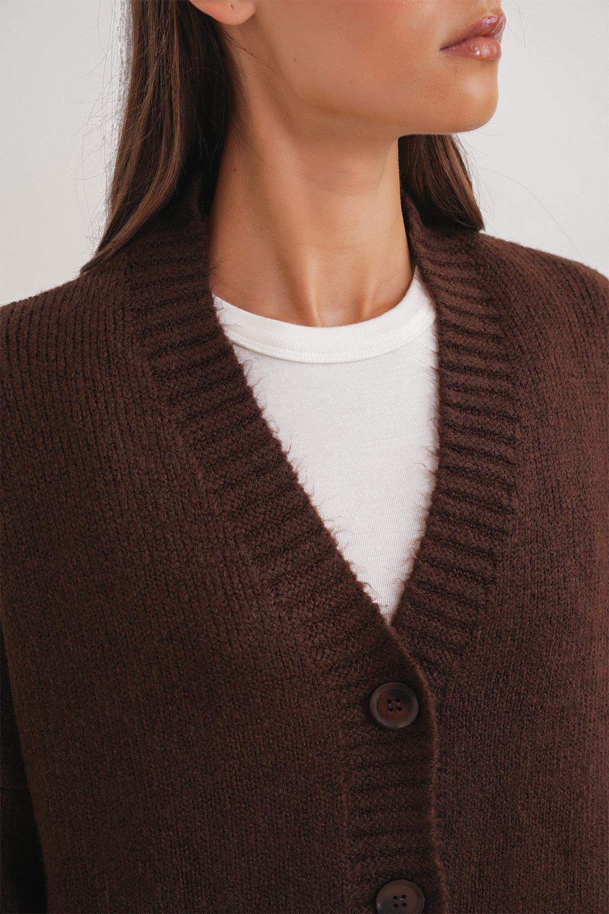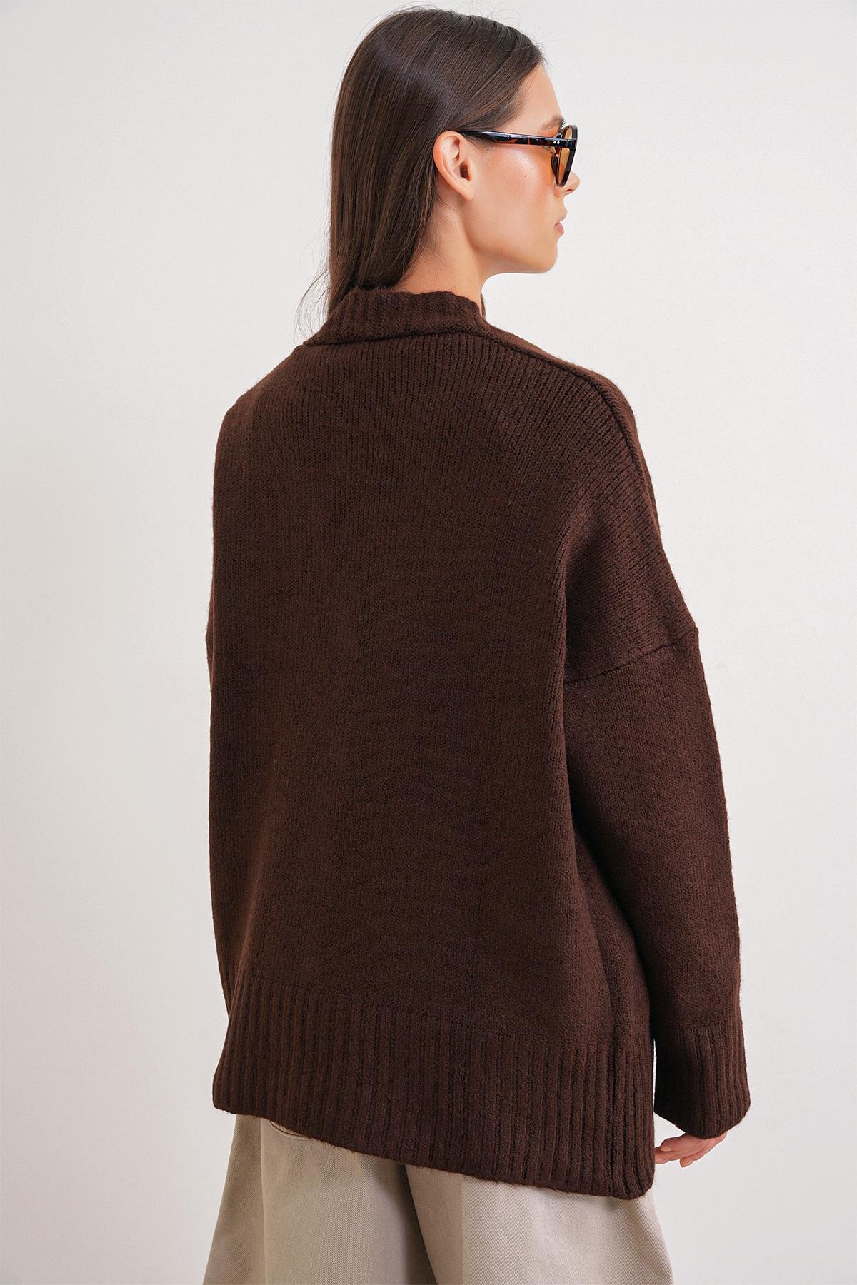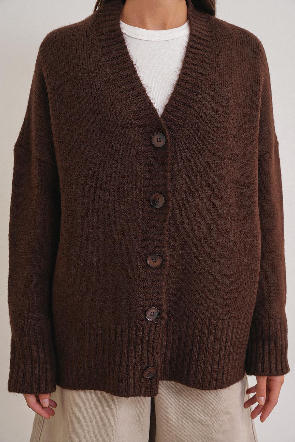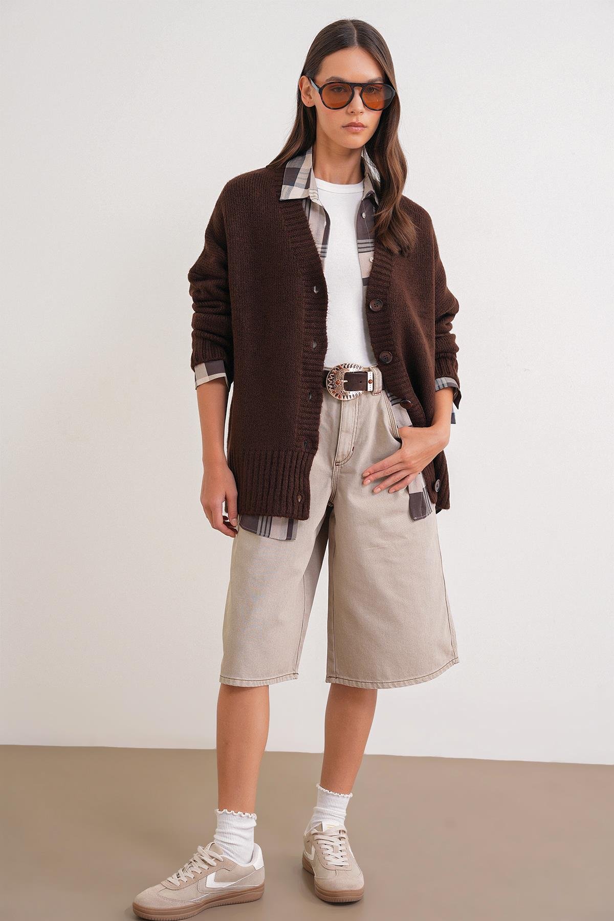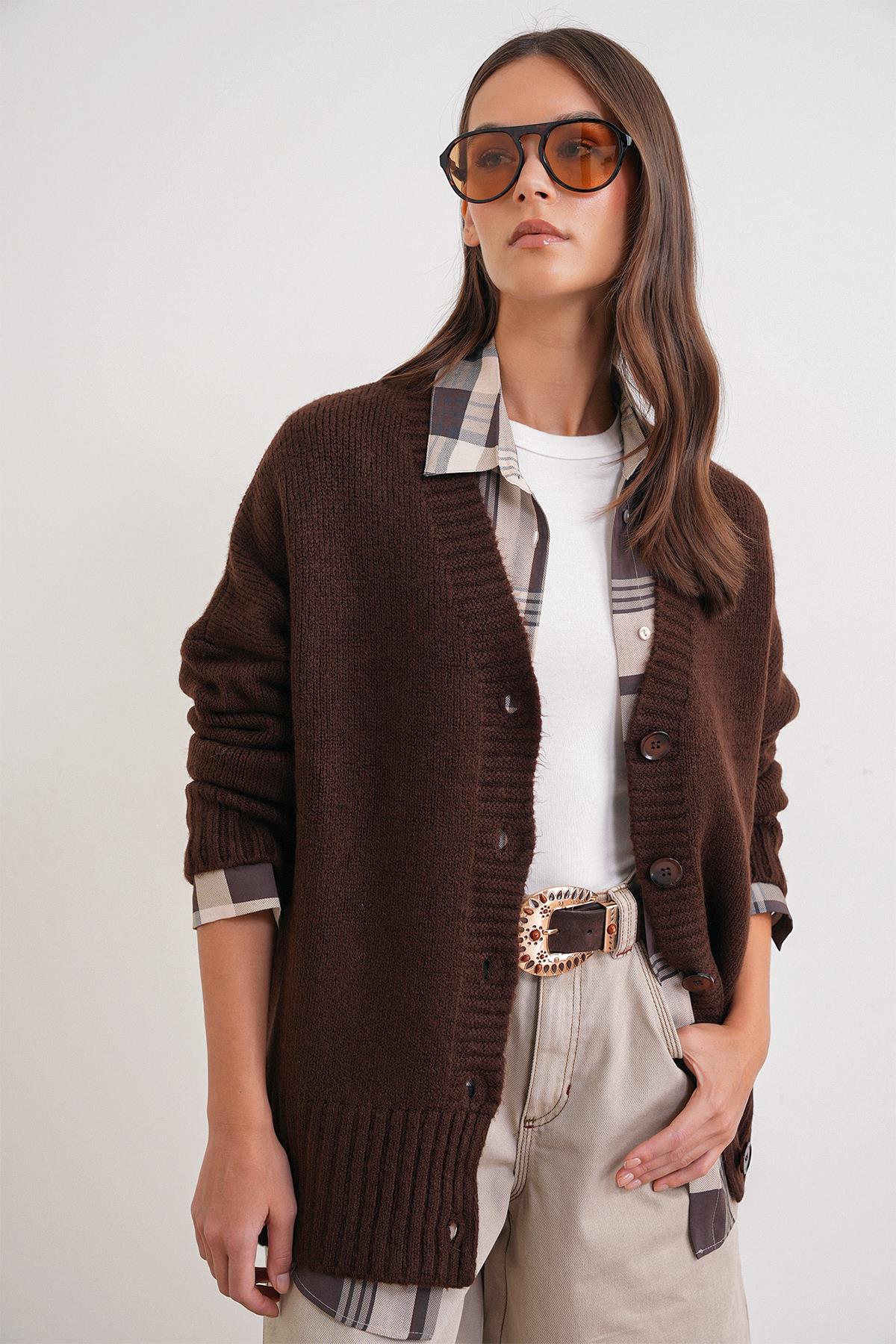 6927 Kadın Yumuşak Dokulu Salaş Basic Triko Hırka Kahve (K24HRK6927-120)