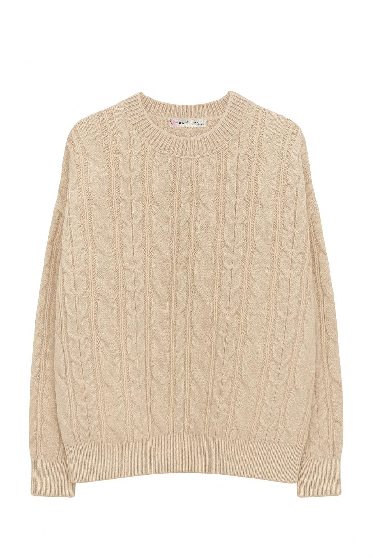 6986 Kadın Oversize Saç Örgü Yumuşak Dokulu Triko Kazak Bej (K25KZK6986-125)