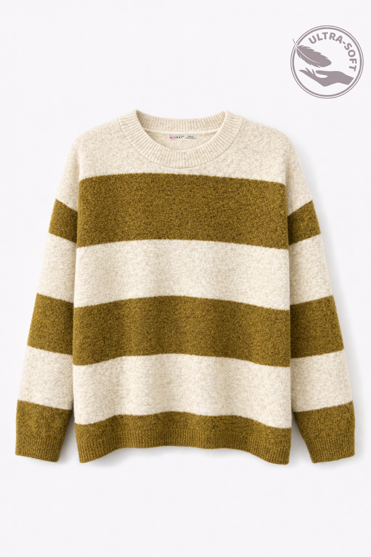 7018 Kadın Yün Karışımlı Yumuşak Dokulu Basic Çizgili Kazak Yağ Yeşili (K25KZK7018-168)